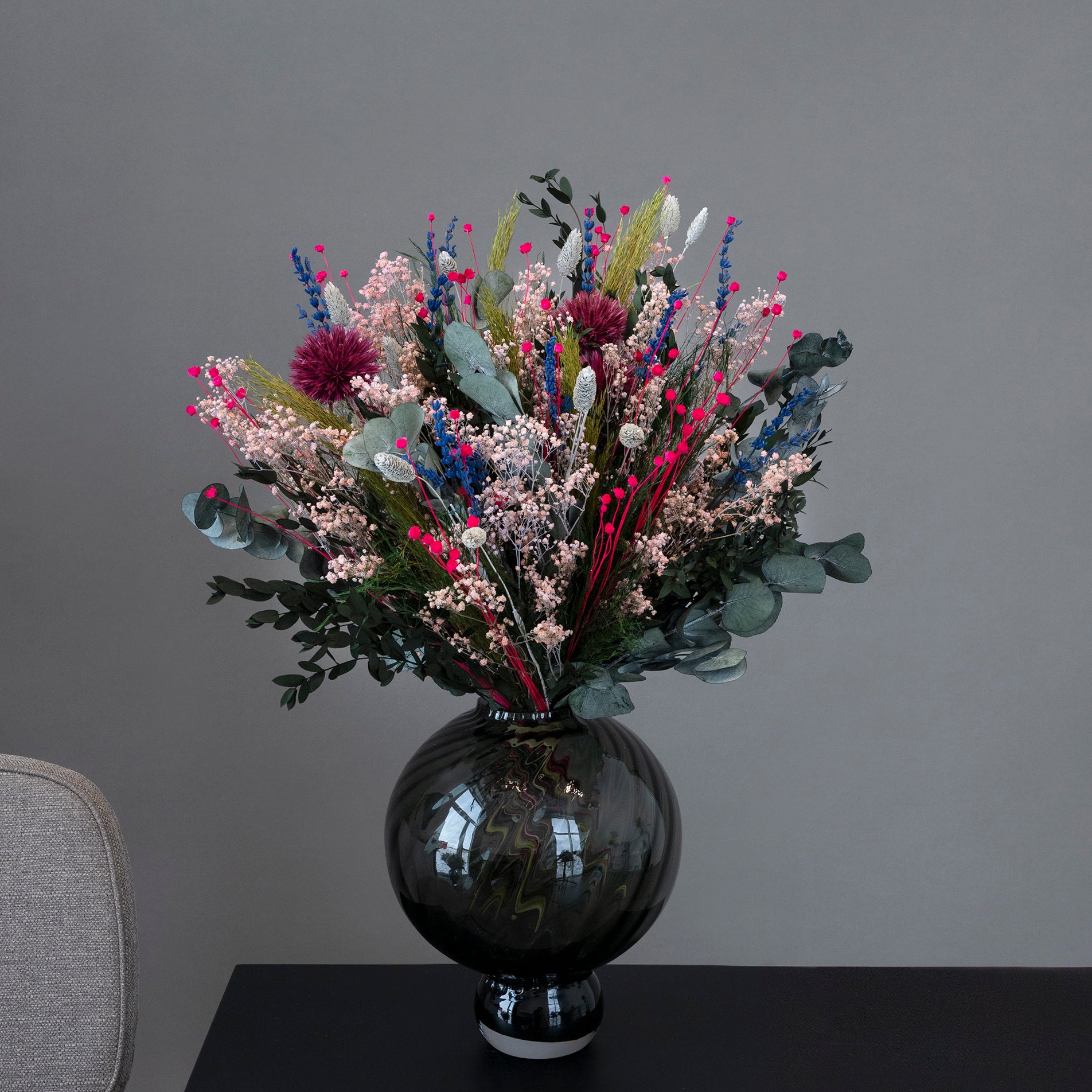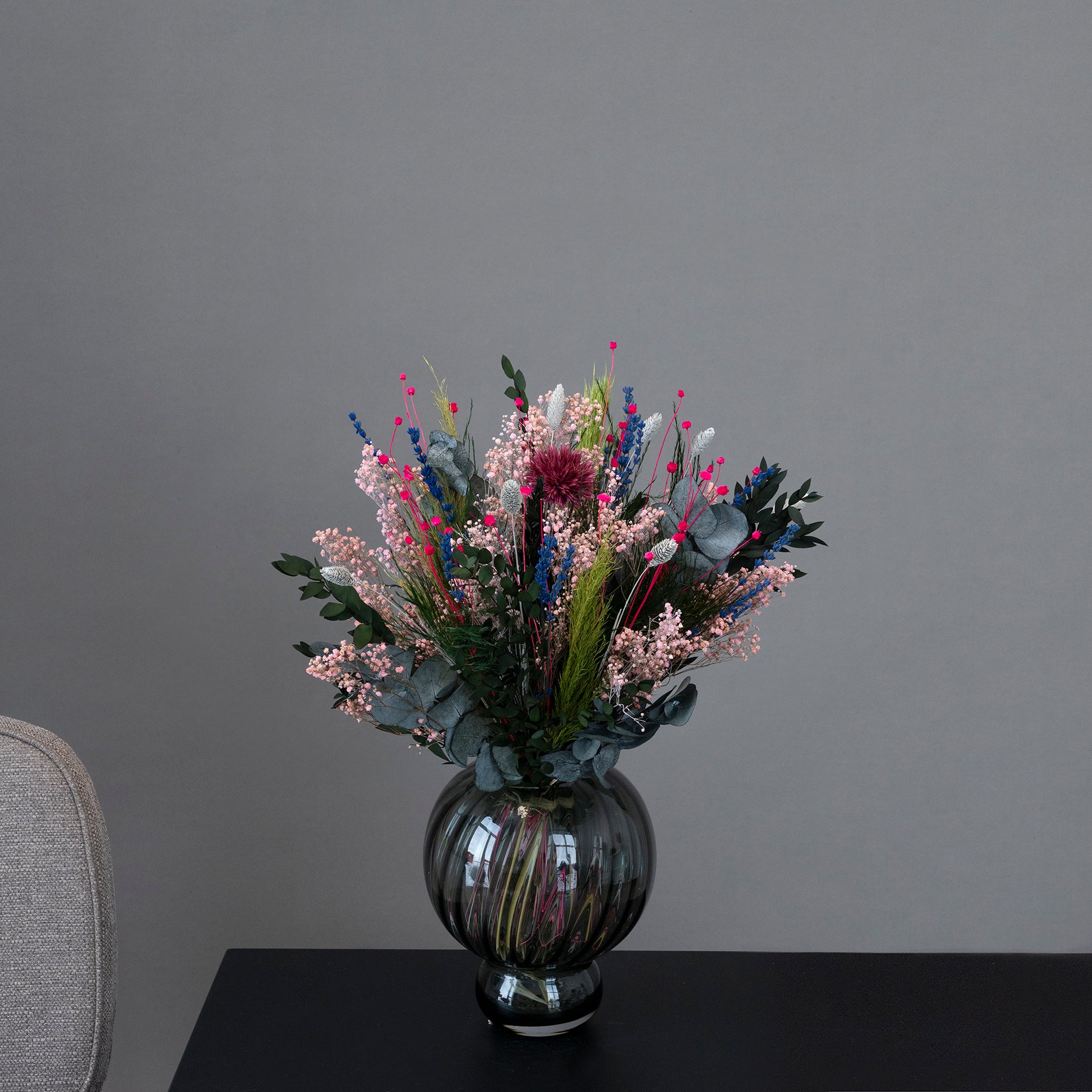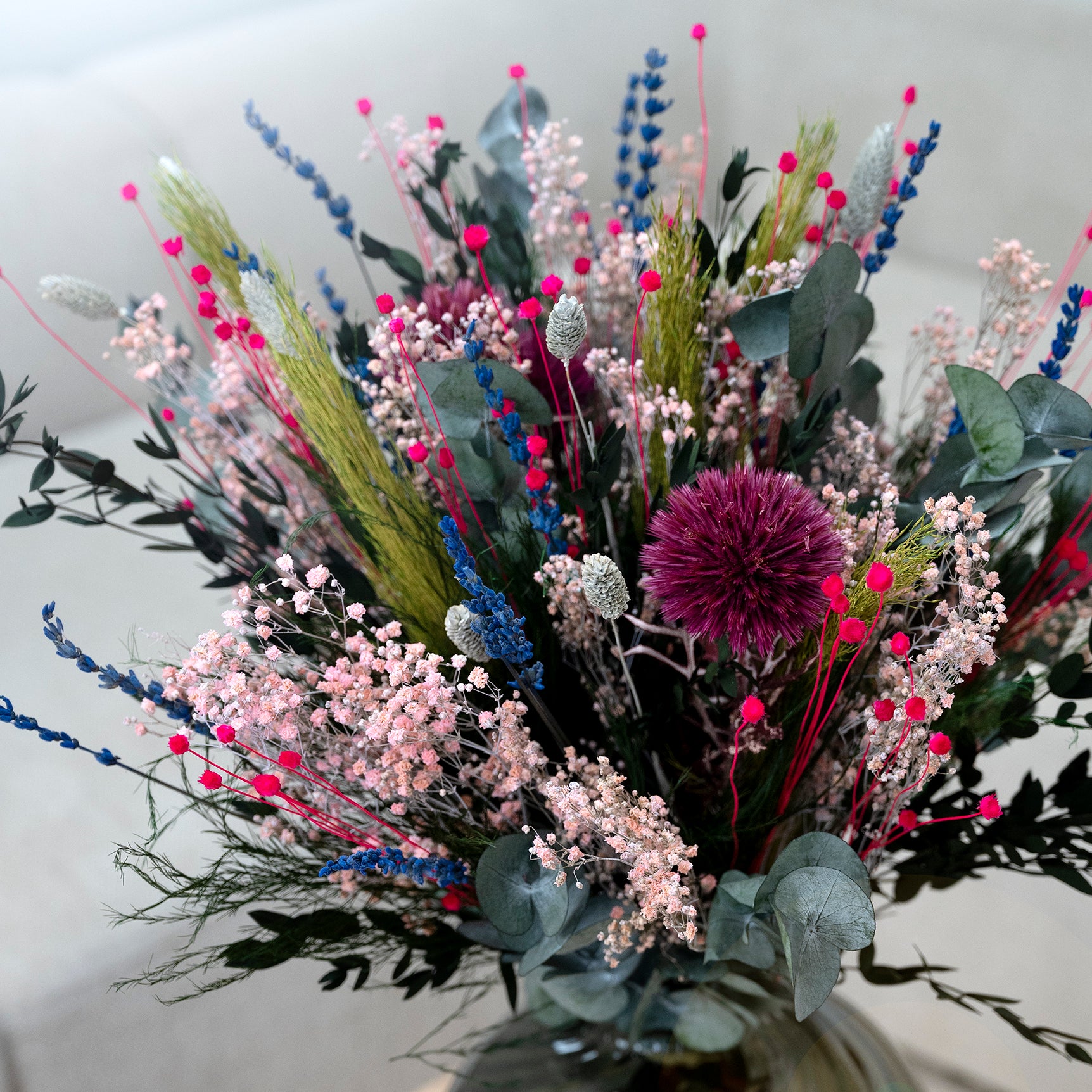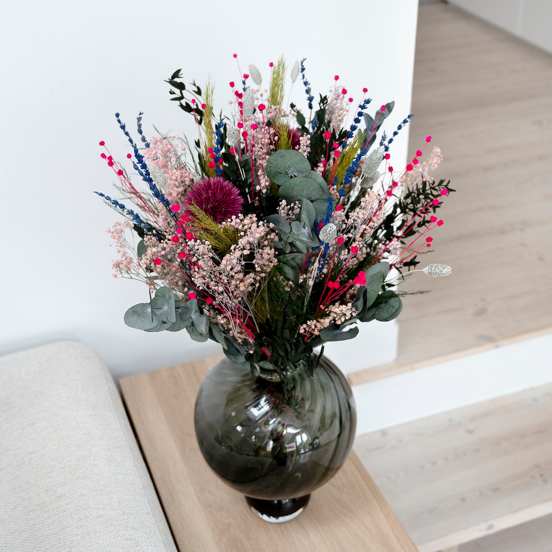 Buketten är sammansatt av levande, klimatsmarta blommor såsom Lavendel, Tistel, Brudslöja och Eukalyptus i form av Espiral Parvifolia och Esparraguera Triffle, samt de torkade inslagen Phalaris och Cana Plumsa. Alla buketter handbinds i Danmark med stort fokus på kvalitet och design.