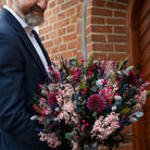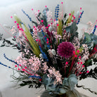 Buketten förför med sina eleganta färger av rosa brudslöja, små rosa blommor och blå lavendeltoner som bryter av och skapar djup. Ett blomsteräventyr – handbundet i Danmark och skapat för att hålla långt efter alla hjärtans dag.