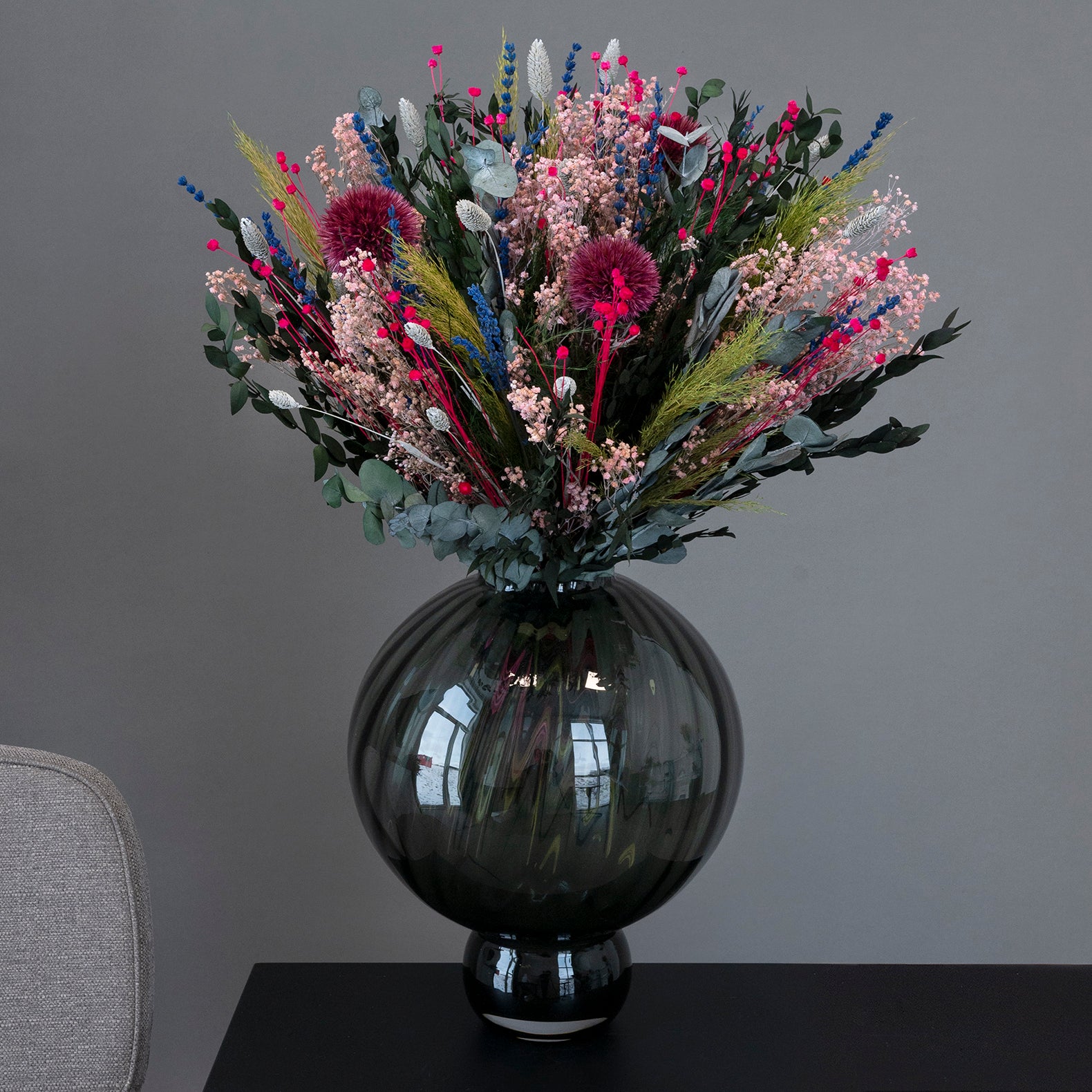 Bukett Storslagen – Har en höjd på 60-65 cm och är 150 % större än storlek Enkel. Denna bukettstorlek är perfekt för en stor köksö eller i golvvasen. Vi rekommenderar breda och runda vaser med en höjd på 30-55 cm.