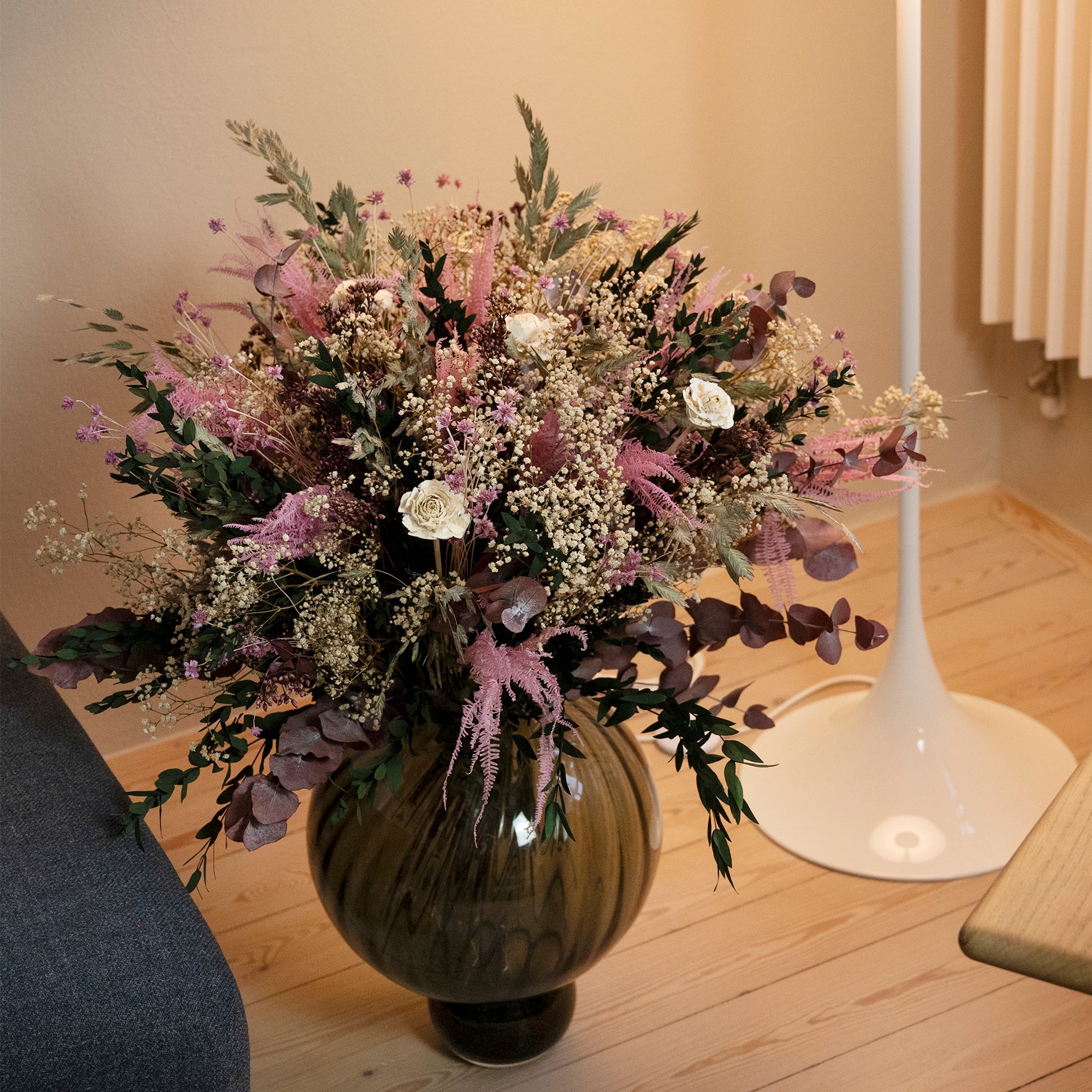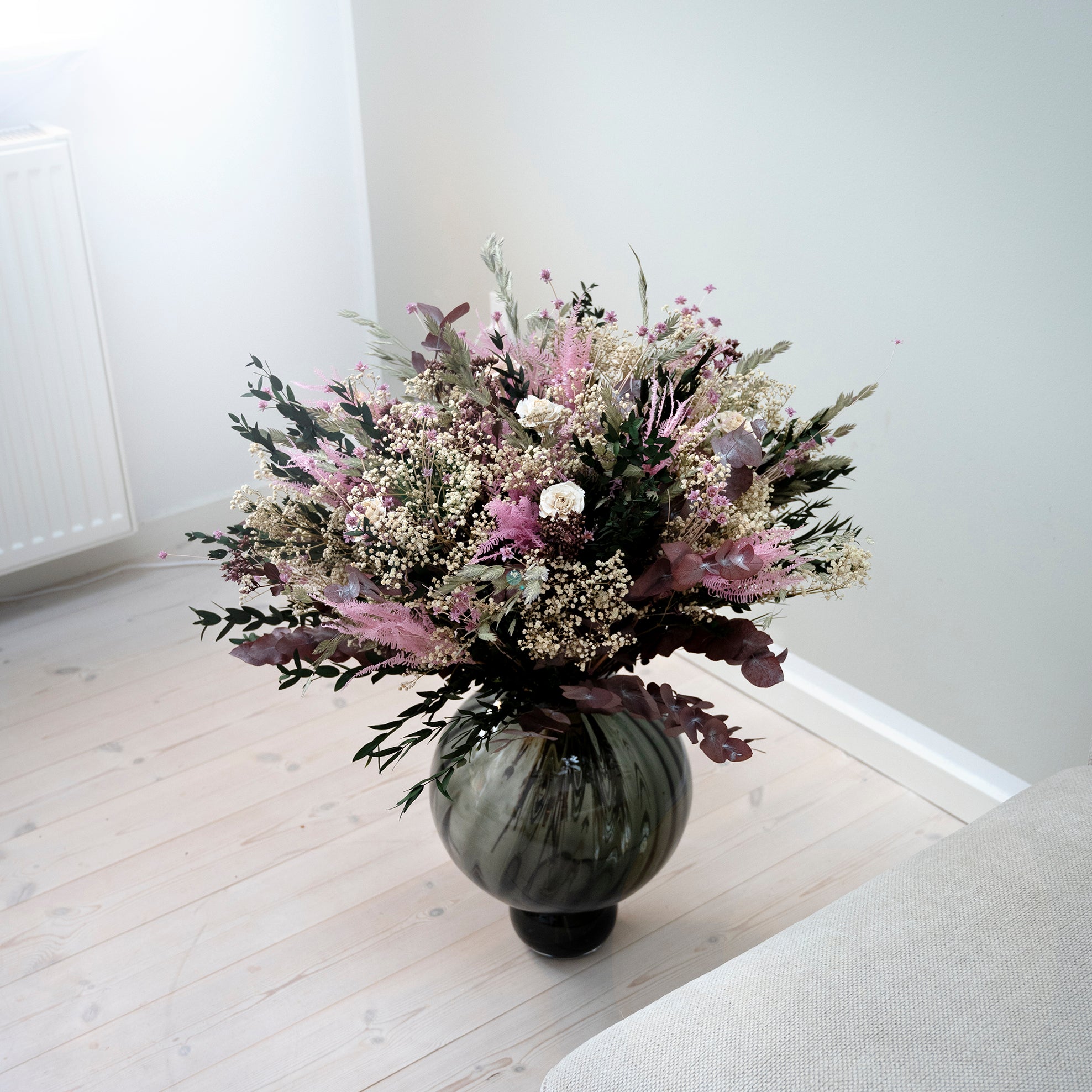 Buketten strålar i mjuka rosa nyanser där den vita Cedarrosen och skira gräs ger lätthet, poesi och vacker kontrast. Ett luftigt och lyxigt uttryck som förmedlar elegans, lugn och känsla.