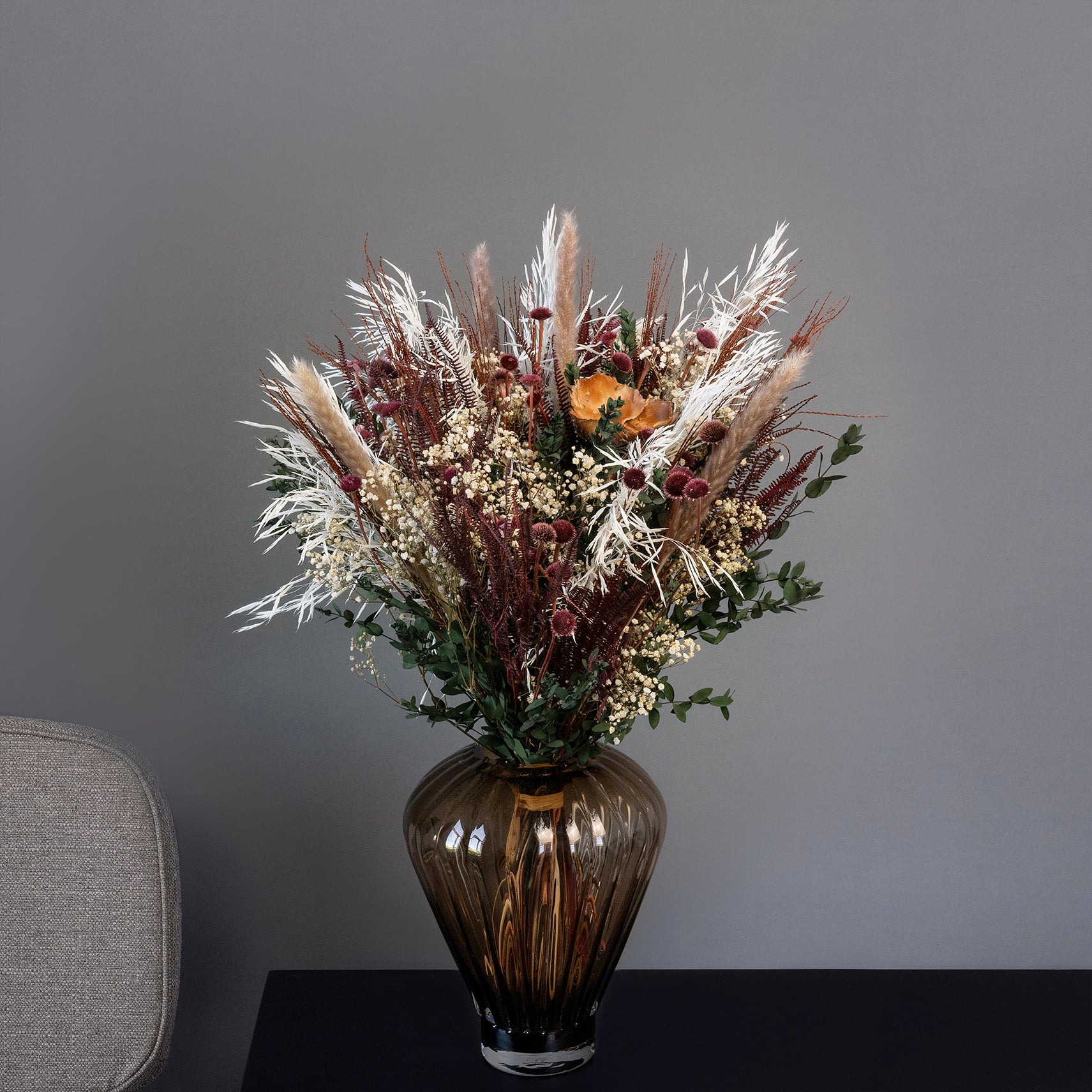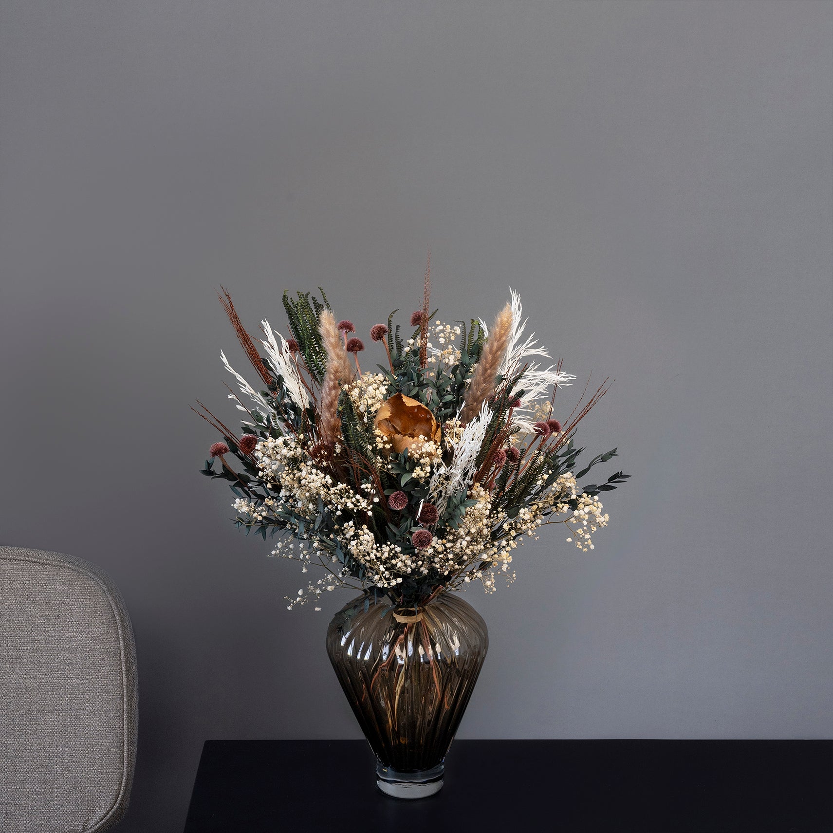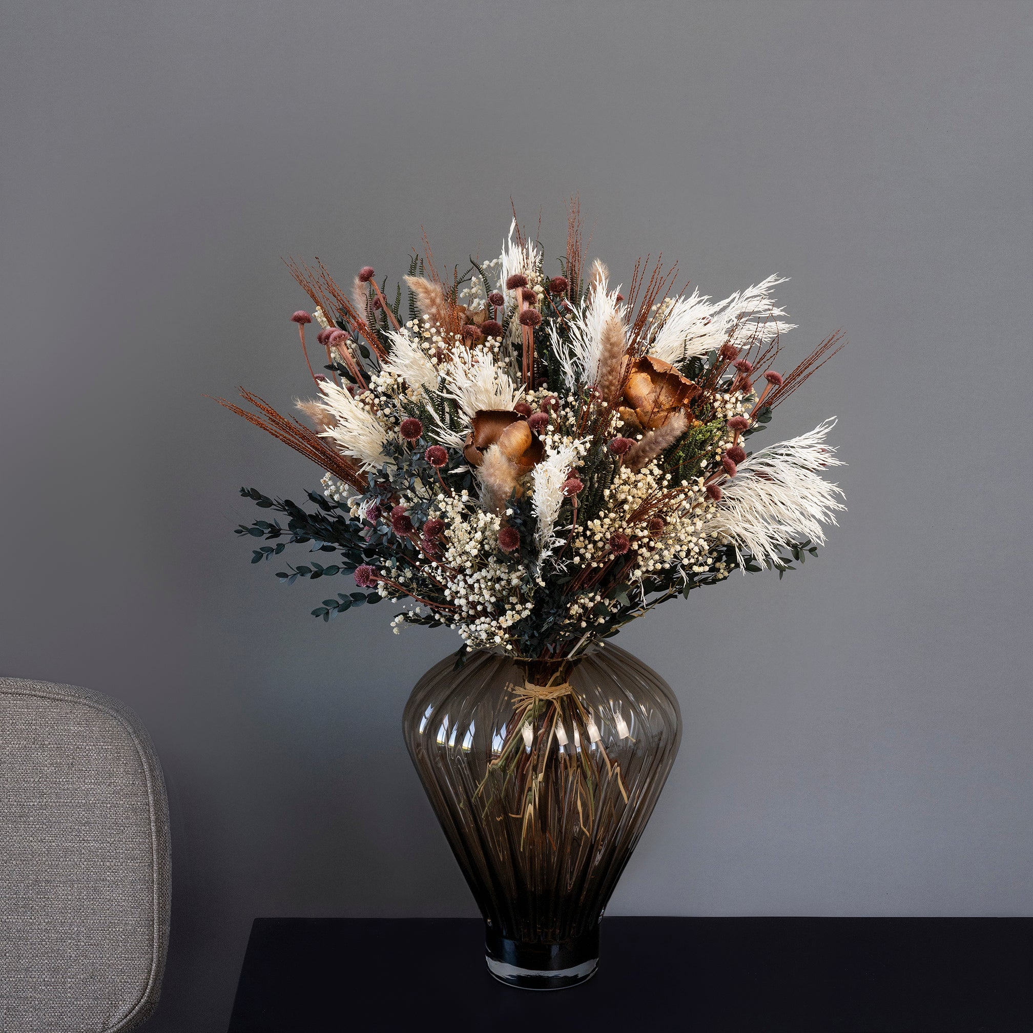 Med sina ljusa och mjuka nyanser ger buketten ett levande spel och en känsla av vinterlig finess. Den passar perfekt som centerpiece på julbordet, som elegant dekoration i vardagsrummet eller som en personlig julhälsning som värmer mottagaren.