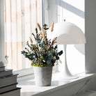 Dekorationen levereras i en kruka tillverkad av återvunnet papper. Den matta ytan och den enkla formen framhäver den nordiska designen och gör den lätt att integrera i både moderna, ljusa hem och mer varma, klassiska miljöer.