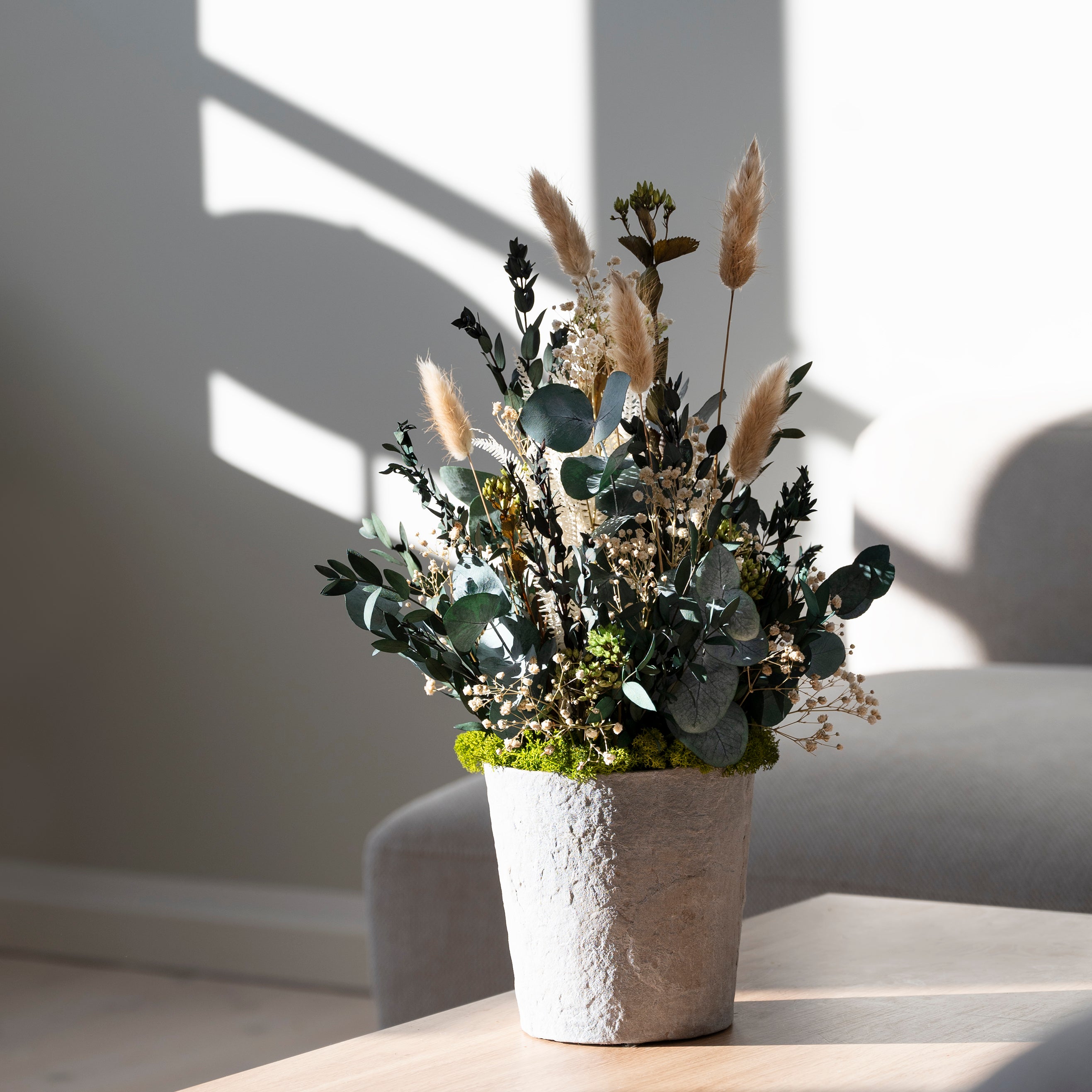 Grön Harmoni är skapad för dig som vill ha ett lugnt och naturligt uttryck i din inredning. De dämpade gröna nyanserna i kombination med lätta naturfärgade inslag skapar en balanserad blomsterdekoration i kruka som känns både elegant och jordnära.