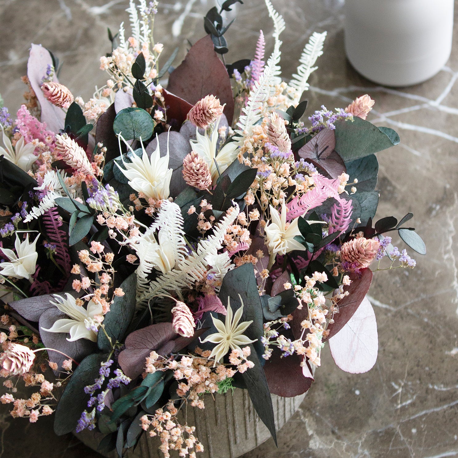 Våra buketter är varken som traditionella färska eller torkade blommor – de är någonstans mittemellan.