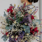 Buketten är sammansatt av ett härligt mix av levande blommor: Eucalyptus Espiral, Eucalyptus Populus, Limonium, Lavendel och Brudslöja, alla med bevarad doft, samt den torkade Phalaris.