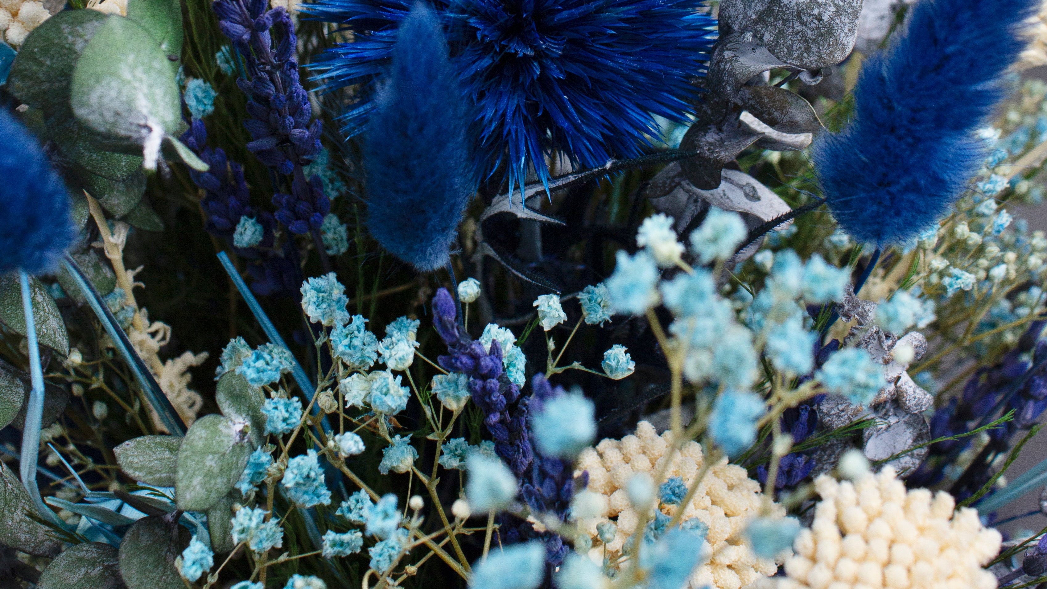 Buketten är bunden av en vacker blandning bestående av de levande blommorna Lavendel, Echinops, Achillea Silvestri, Eucalyptus Babyblue, Lonas, Trifle, Esparraguera Foxtail, Princess Grass, Celosia samt de torkade blommorna Lagurus och Capin Stela.