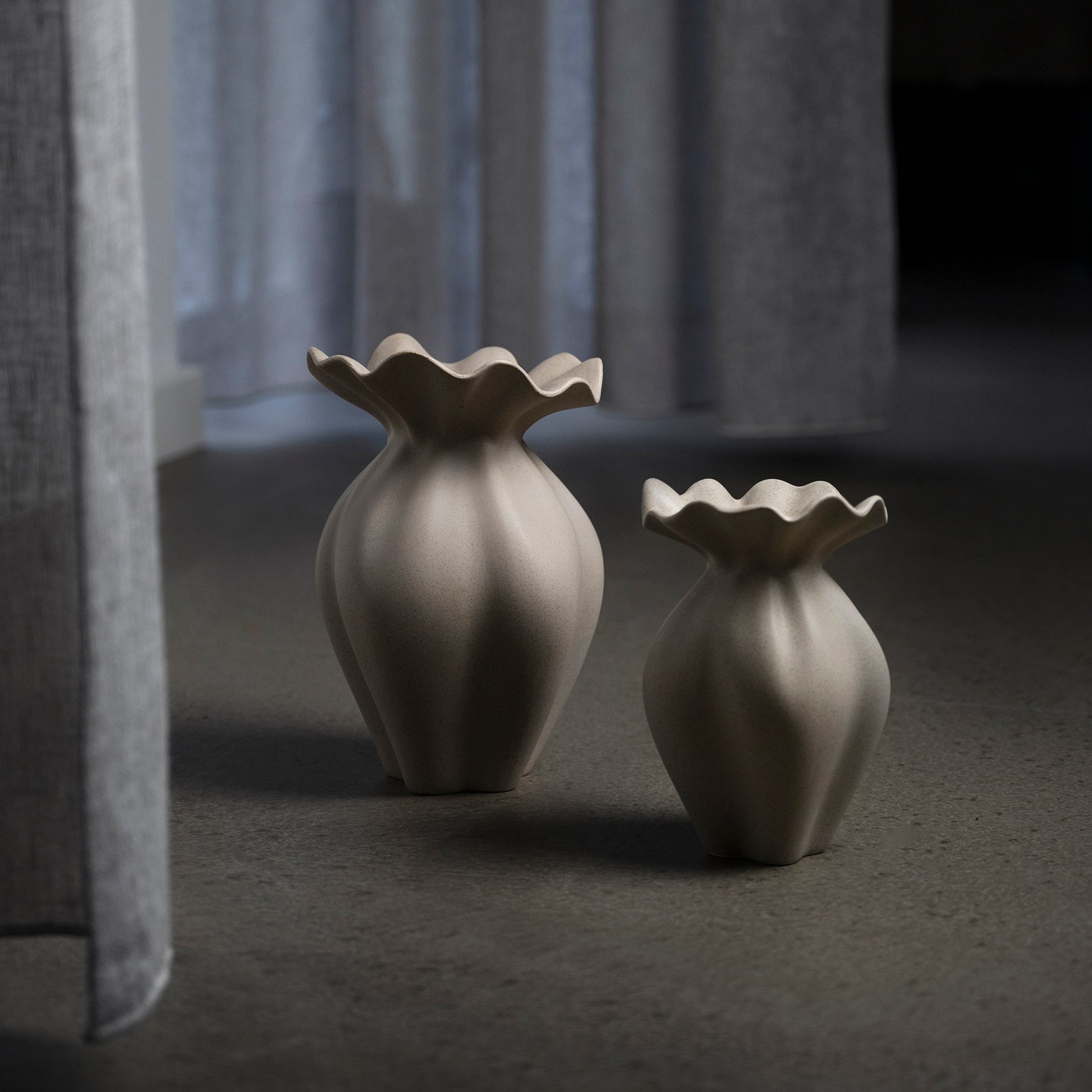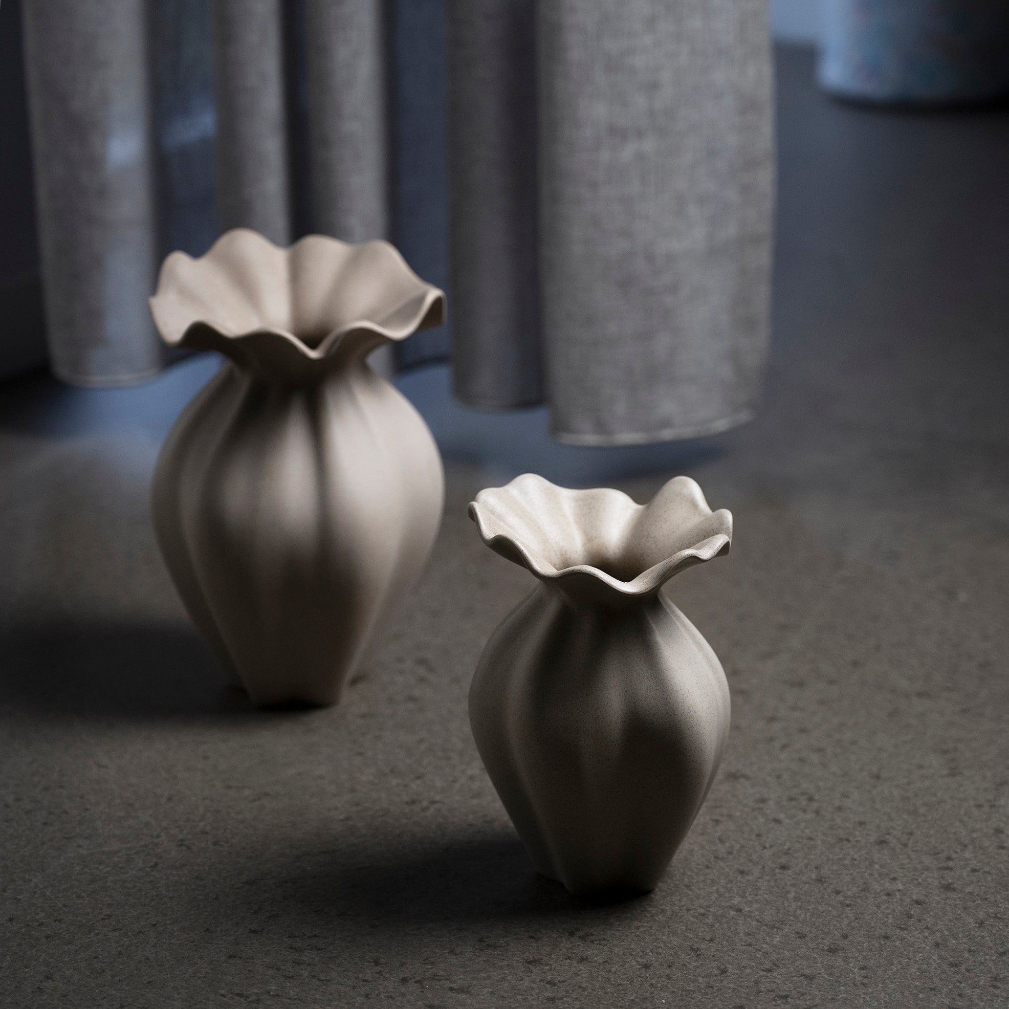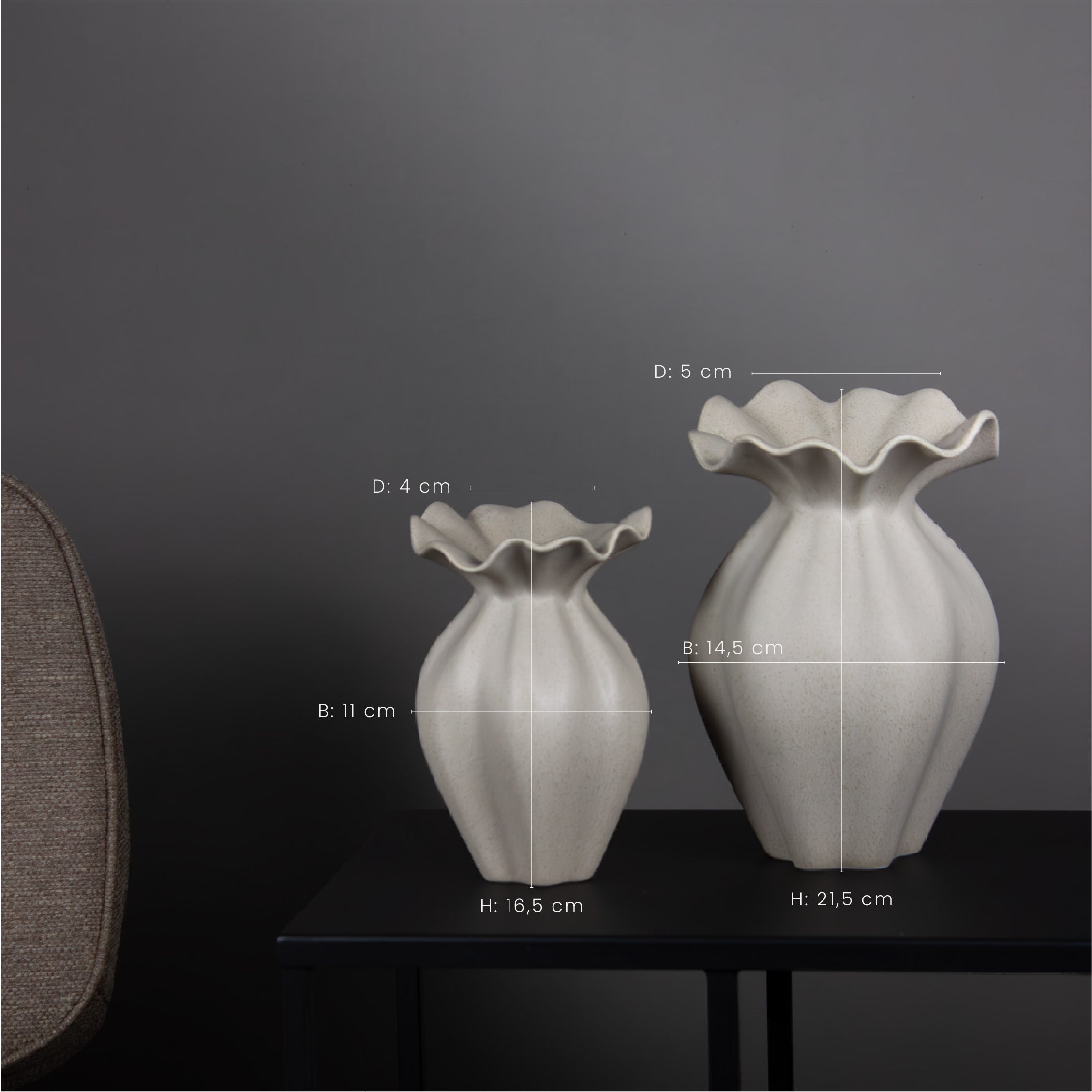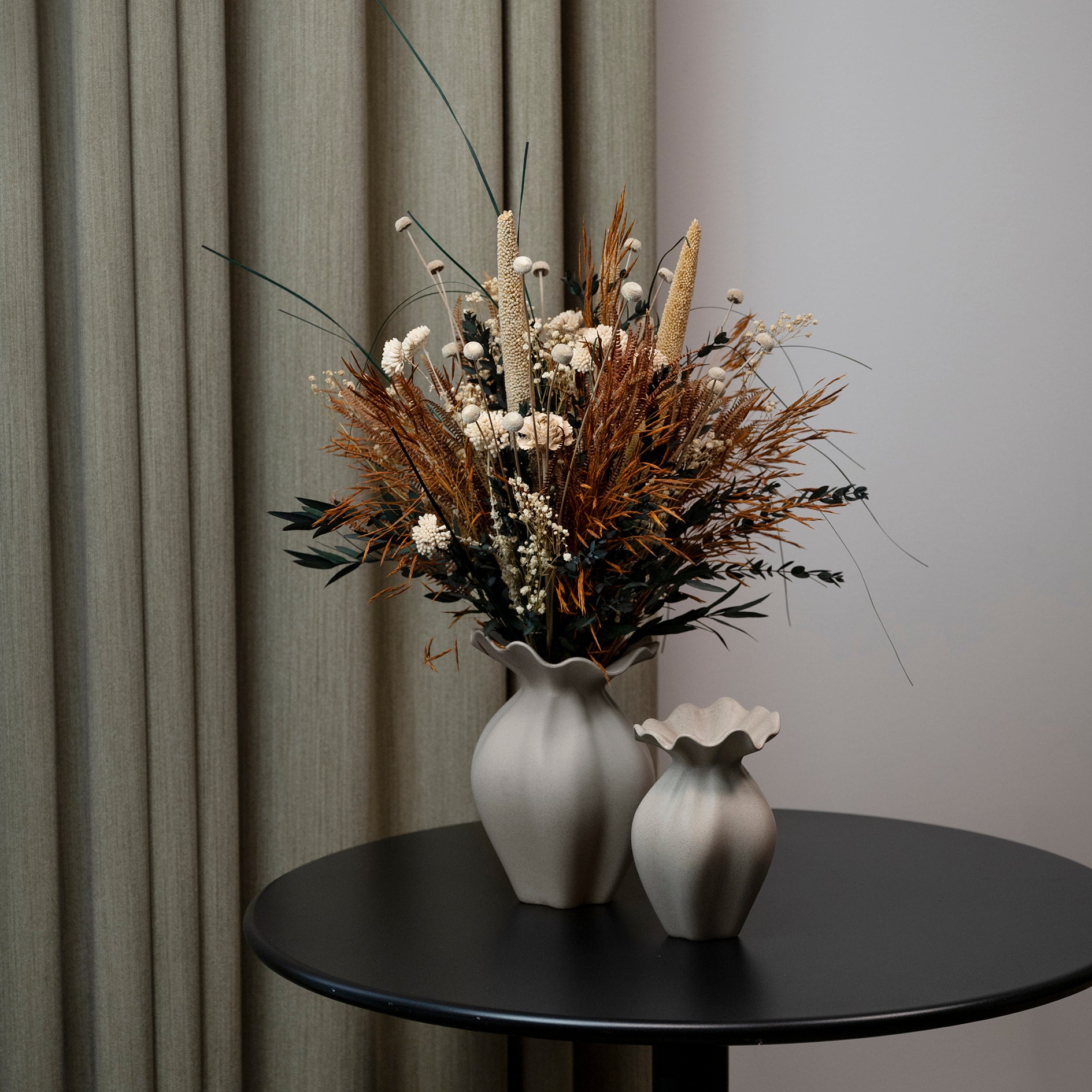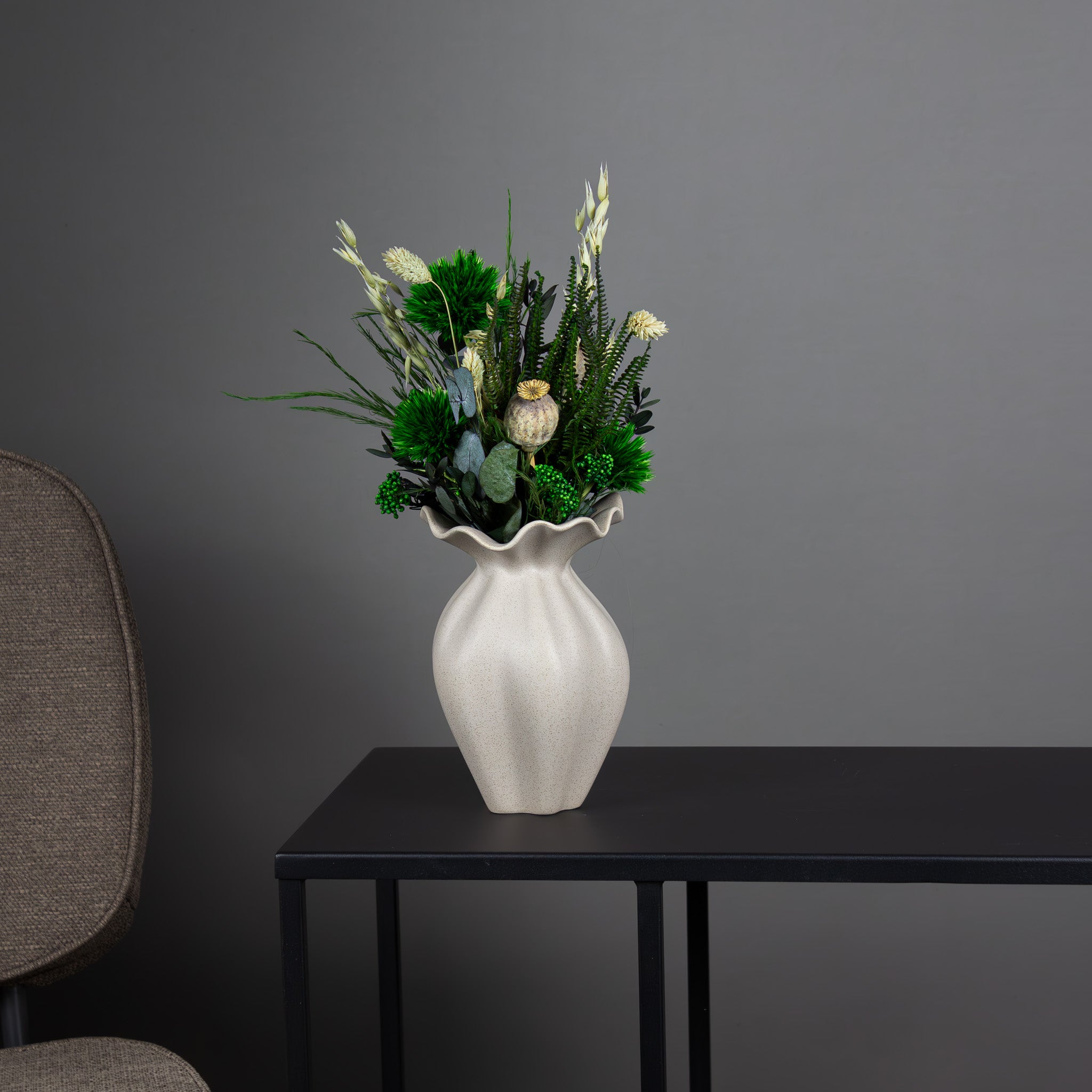 Matteo-vasen är designad i vackra mjölkigt vitgrå nyanser, som ger ett elegant och modernt inslag till varje hem. Med sin raffinerade design och känsla för detaljer är denna vas inte bara praktisk utan också ett dekorativt element som kan stå för sig själv som ett konstverk eller kombineras med någon av våra buketter för att ge stil till vilket rum som helst.